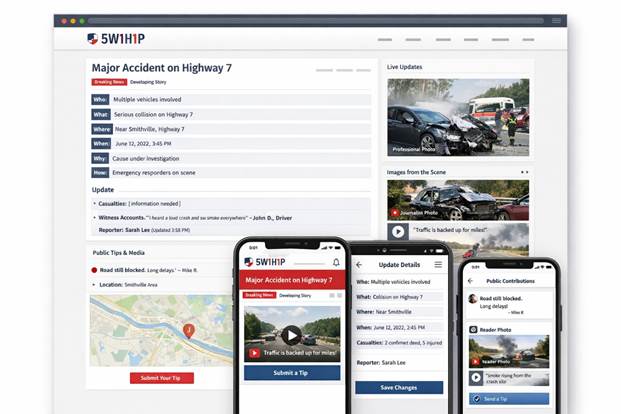 A newsroom reimagined for the digital age. Journalists publish evolving reports in a standardized 5W1H format that highlights what’s known and what’s missing. Accredited reporters update facts, add sources, and refine narratives as events unfold. Readers can follow without logging in, submit tips or media, and have their contributions clearly labeled and linked to the professional record. The result: speed, transparency, and a layered public archive that preserves provenance and trust. |